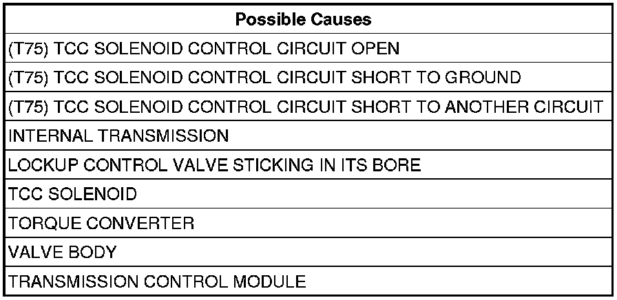 - Repair the (T75) TCC Solenoid Control circuit for an open.