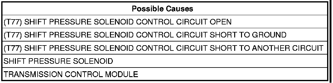- Repair the (T77) Shift Pressure Solenoid Control circuit for a short to ground.