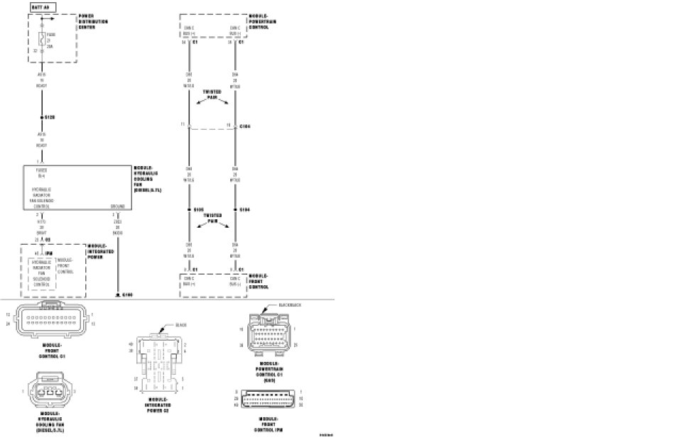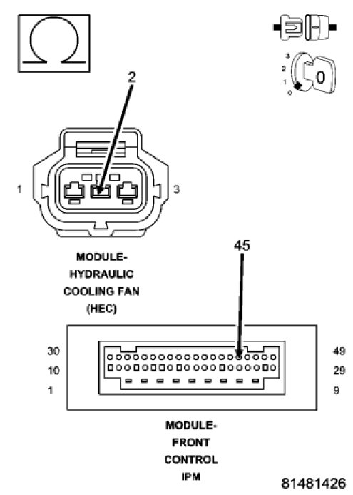 Using the wiring diagram/schematic as a guide, inspect the wiring and connectors between the Hydraulic Cooling Fan and the Front Control Module (FCM).