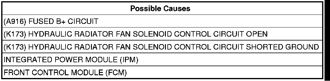 Measure the resistance of the (K173) Hydraulic Radiator Fan Solenoid control circuit from Fan Module harness connector to the IPM FCM 49 way harness connector.