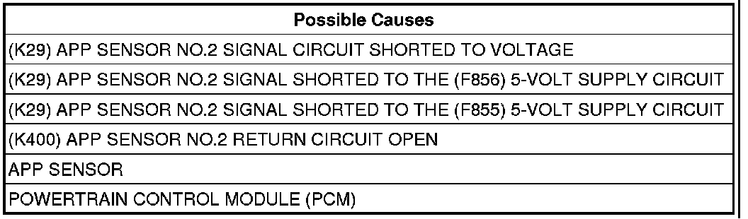 - Repair the short between the (K29) APP Sensor No.2 Signal circuit and the (F856) 5-volt Supply circuit.