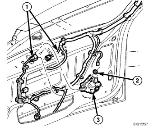 1. Position the latch (3) into the inside of the liftgate and align using the marks made during removal.