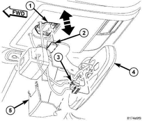 1. Position the mirror assembly (4) into position in the over head console.