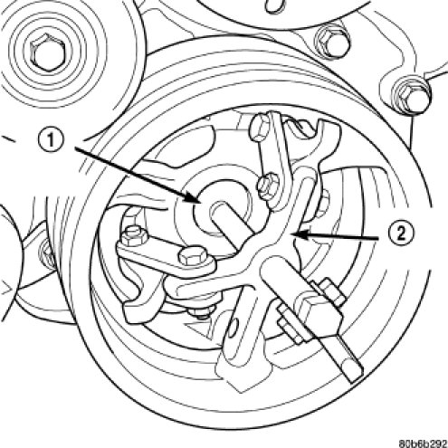 9. Remove damper using Crankshaft Insert 8513 (1) and Three Jaw Puller 1026 (2).
