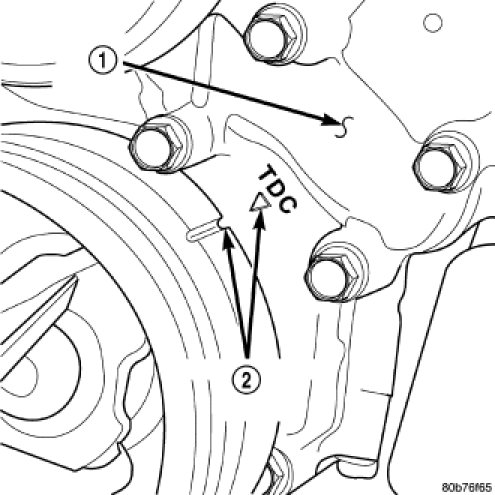 2. Using a mirror, locate the TDC arrow (2) on the front cover (1). Rotate the crankshaft until the mark on the crankshaft damper is aligned with the TDC arrow on the front cover. The engine is now at TDC.