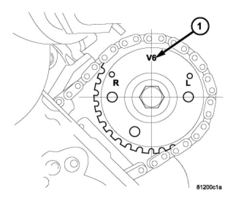 1. Ensure that the engine is at TDC with both camshaft sprocket V6 marks (1) in the 12 o'clock position.