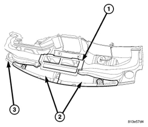 The two slot-type defroster outlets located near the center of the instrument panel receive airflow from the HVAC housing through the molded plastic main distribution duct (1) and defroster ducts (2), which are attached to the bottom of the instrument panel top cover (3).