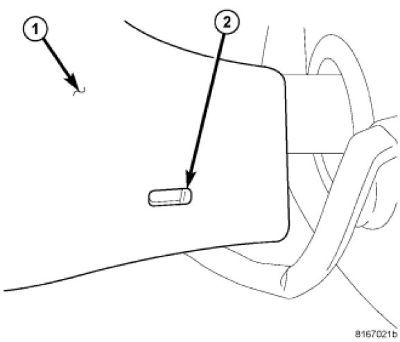 2. Insert a screwdriver into the slot (2) on each side of the inside rear view mirror mount (1) to depress the tabs that secure the cover to the underside of the mount.