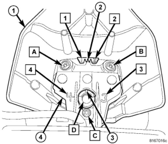 NOTE: The SmartBeam(R) inside rear view mirror is manufactured with both the horizontal index pointer (2) and vertical index pointer (3) located in their central or neutral positions, as shown in the illustration.