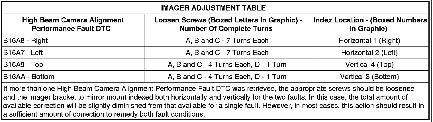 NOTE: The following procedure is used to mechanically adjust the SmartBeam(R) imager (camera) ONLY after the SmartBeam(R) Calibration Procedure has resulted in a High Beam Camera Alignment Performance Fault - Left, Right, Top or Bottom Diagnostic Trouble Code (DTC) or a combination of any two of these faults being set. The imager bracket is assembled to the inside rear view mirror mount with three screws. The following procedure details the proper steps for indexing the imager bracket to the mirror mount to correct each fault or combination of faults. However, retrieval and erasure of the DTC to complete and verify the procedure will require the use of a diagnostic scan tool. Refer to the appropriate diagnostic procedures.