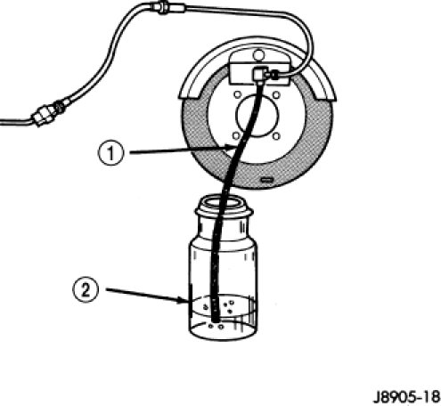 3. Attach one end of bleed hose to bleed screw and insert opposite end in glass container partially filled with brake fluid. Be sure end of bleed hose is immersed in fluid.