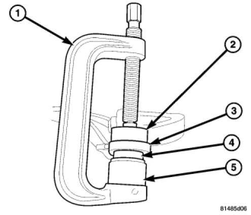 1. Install the ball joint (4) into the control arm (3) and press in using special tools C-4212-F (press) (1), 9654-1 (Driver) (5) and 9654-2 (Receiver) (2).