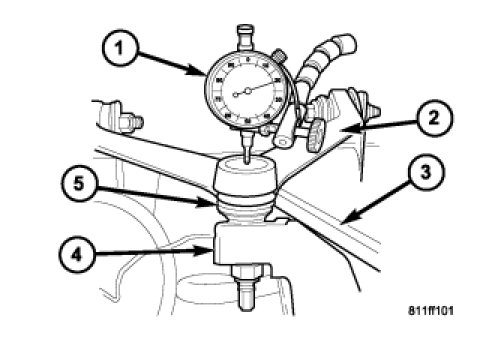 4. Position dial indicator plunger on the topside of the upper ball joint (5).