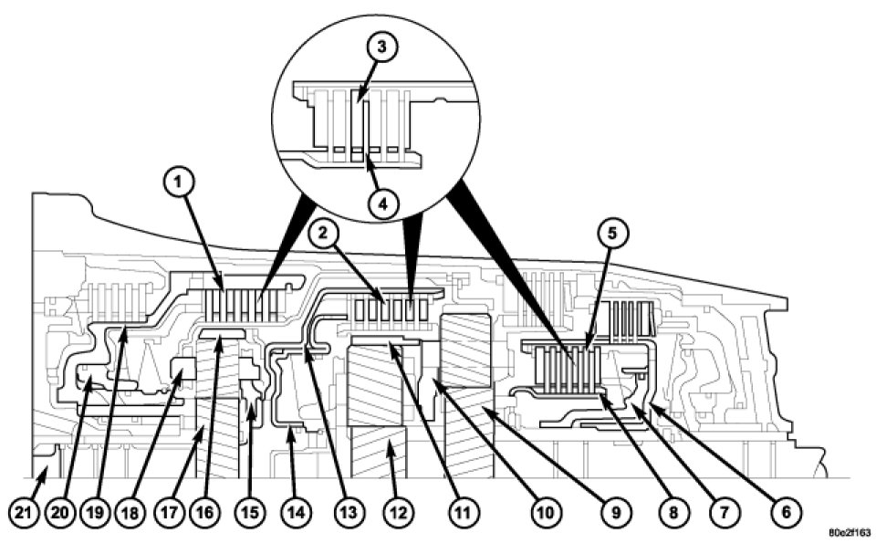 If the multi-plate clutch K2 (2) is actuated via the piston (14), the piston compresses the disc set. The annulus gear (16) of the front planetary gear set is locked with the annulus gear (11) of the center planetary gear set via the externally toothed disc carrier (13) and the center planetary carrier (10) on which the internally toothed discs are seated. Annulus gear (16) and annulus gear (11) turn at the same speed as the input shaft (21)