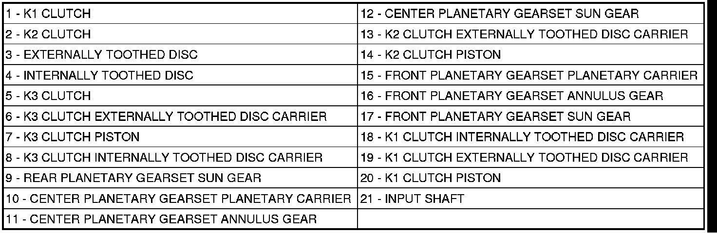 If the piston (20) on multi-plate clutch K1 (1) is subjected to oil pressure, it presses the internal and external discs of the disc set together. The sun gear (17) is locked with the planetary carrier (15) via the externally toothed disc carrier (19) and the internally toothed disc carrier (18). The front planetary gear set is thus locked and turns as a closed unit.
