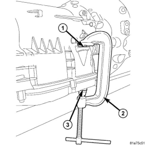 b. Position a shim stock (3) between the "C" clamp (2) and the edge of the transmission oil pan.