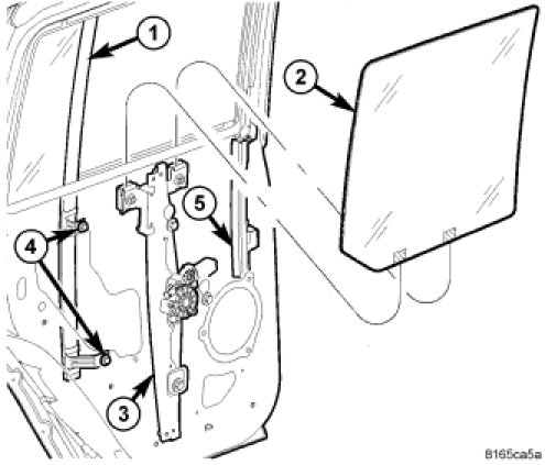 2. Rotate the door glass into position and engage it to the window regulator glass clamps.