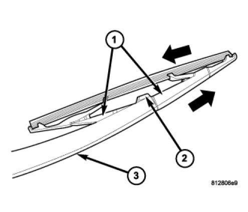 2. To remove the blade from the wiper arm, squeeze the two latch release tabs (2) together while pulling the blade straight out from the receptacle in the end of the arm.