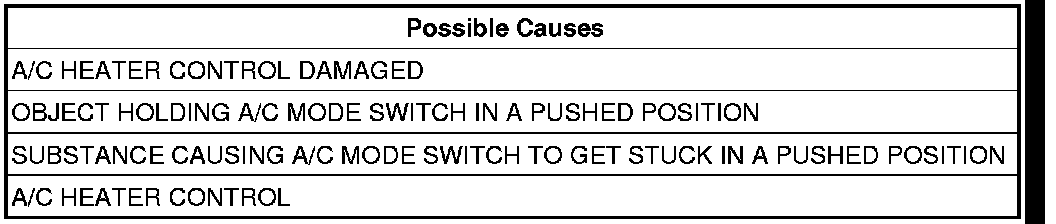 Inspect the A/C Heater Control for anything that would cause the A/C mode switch to stay or stick in a pushed position.