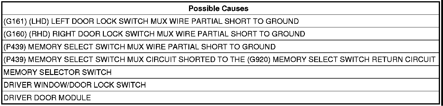 If this vehicle is equipped with the Memory System, the supply circuit for the Memory Mirrors are supplied by the Driver Door Module. Therefore, both the Memory Select Switch Mux or the Door Lock Switch Mux circuits can cause this DTC to set.