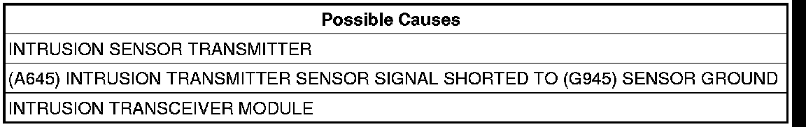 - Repair the (A645) Intrusion Transmitter Sensor Signal circuit for a short to the (G945) Sensor Ground circuit.