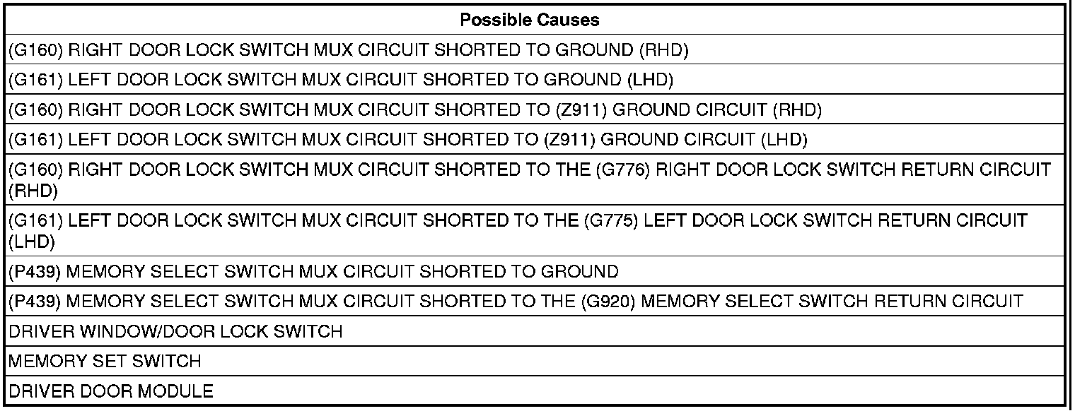 If the Driver Door Module either receives a conflicting input from the (P439) Memory Select Switch Mux circuit or the (G160/G161) Right/Left Door Lock Switch Mux circuit or the module senses voltage is less than 0.2 volts on the (P439) Memory Select Switch Mux circuit or the (G160/G161) Right/Left Door Lock Switch Mux circuit.
