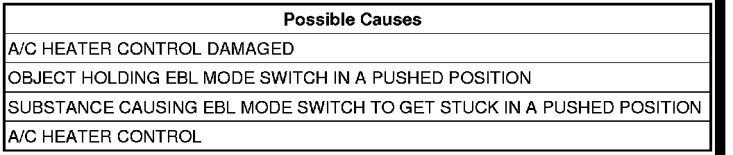Inspect the A/C Heater Control for anything that would cause the EBL mode switch to stay or stick in a pushed position.