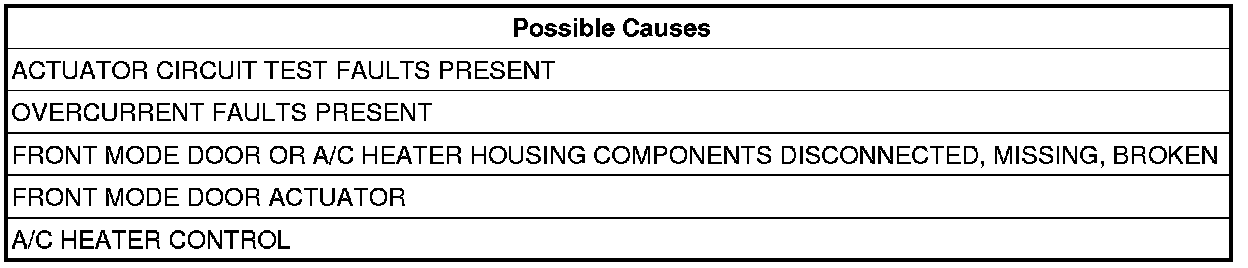 The purpose of actuator calibration is to determine the total span of door travel between physical stops. To calibrate the actuator, the A/C Heater Control first moves the door to its soft stop, and then counts the number of pulses it takes to move the door to its other stop. An expected range of span is stored in the control's memory. If the A/C Heater Control detects and excessive amount of commutator pulses when calibrating the front mode door, this DTC will set.