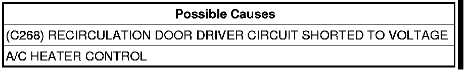 - Repair the (C268) Recirculation Door Driver circuit for a short to voltage.