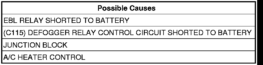- Repair the (C115) Defogger Relay Control circuit for a short to battery.