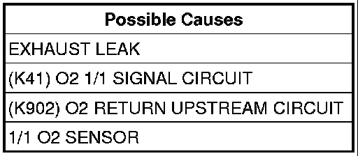 - Check the (K41) O2 1/1 Signal circuit for a short to ground, open, or short to voltage. If OK, replace and program the Powertrain Control Module.