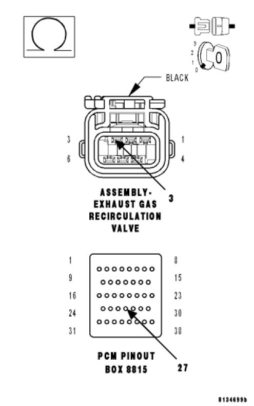 Using a voltmeter, perform a voltage drop test by backprobing the (K35) EGR Control circuit at the EGR Valve Assembly harness connector and probing the appropriate terminal of the special tool #8815. Make sure the voltmeter leads are connected so that positive polarity is displayed on the voltmeter.