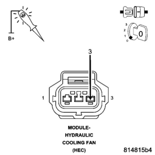 Using a 12-volt test light connected to B+, probe the (Z823) Ground circuit in the Hydraulic Cooling Fan Module harness connector.