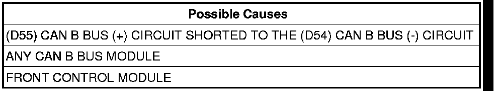 The FCM detects the (D55) CAN B Bus (+) circuit is shorted to the (D54) CAN B Bus (-) circuit.