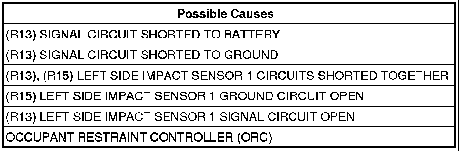 - Repair the (R13) Left Side Impact Sensor 1 Signal circuit for an open or high resistance.
