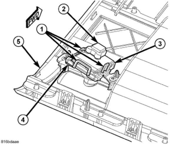1. Position the intrusion sensor receiver (3) to the mounting bracket (4) on the left rear corner of the overhead console housing (5).