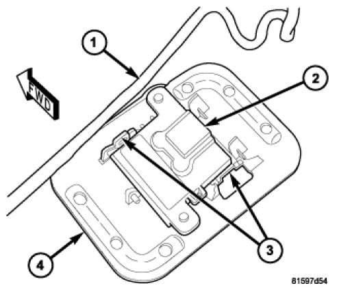 1. Carefully pull down the left rear edge of the headliner from the upper liftgate opening far enough to reach between the headliner and the roof panel to position the intrusion sensor transmitter (2) over the locating pins of the mounting bracket (4) on the headliner substrate.