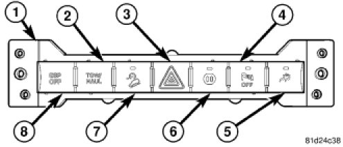 The upper instrument panel switch pod (1) is located just above the heater and air conditioner controls in the center stack area of the instrument panel. This switch is available in multiple configurations, which vary depending upon the equipment in the vehicle. However, every available configuration includes the hazard warning push button switch. The upper pod may include the following switches: