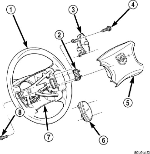 2. Remove the driver side airbag (5) from the steering wheel (1). Driver Airbag - Removal.
