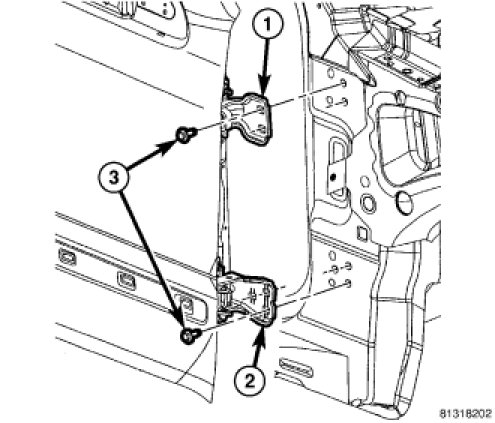 5. If necessary, loosen the five bolts (3) that secure the front door hinges (1 and 2) to the A-pillar.