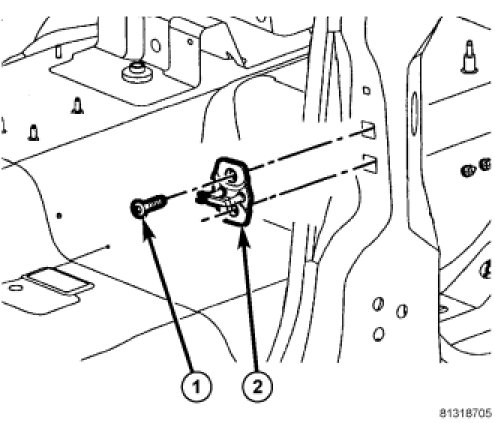 11. Tighten the two bolts (1) that secure the striker (2) to the b-pillar. Tighten the bolts to 28 Nm (21 ft. lbs.).