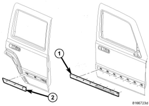 2. Remove protective cover from tape on back of molding (1 or 2). Apply molding to body below the masking tape guide.