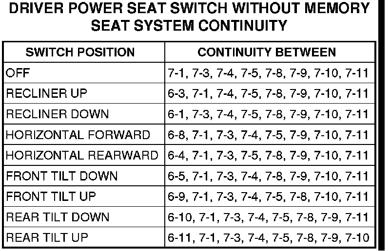 3. Use an ohmmeter to test the continuity of the power seat switch. Refer to DRIVER POWER SEAT SWITCH WITHOUT MEMORY SEAT SYSTEM CONTINUITY table. If not OK, replace the faulty power seat switch. If switch tests OK, refer to Power Seat Adjuster testing Power Seat Adjuster.