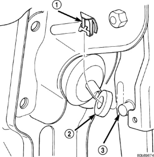 8. Install booster push rod (2) on pedal pin (3) and install retainer clip (1) on pedal pin.