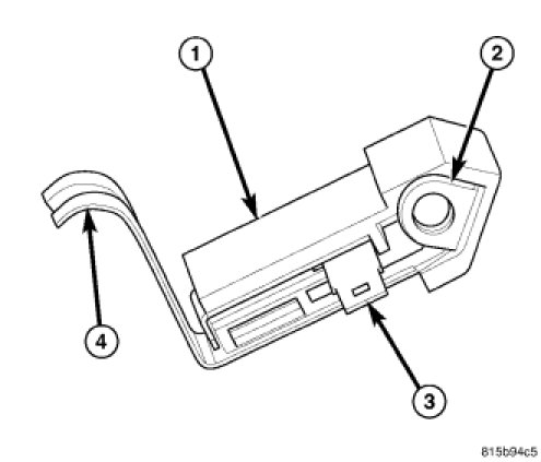 The park brake switch (1) is located on the park brake lever mechanism on the floor panel transmission tunnel below the center floor console. This switch includes a spade-type output terminal (3) that connects the switch to the vehicle electrical system through a dedicated take out and connector of the instrument panel wire harness. The output terminal is integral to the stationary contact within a molded plastic insulator.