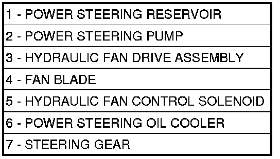 The 5.7L hydraulic cooling fan is integral to the fan shroud and is located between the radiator and the engine.