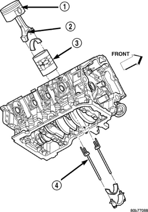 3. Use piston ring compressor (3) and Guide Pins Special Tool 8507 (4) to install the rod and piston assemblies. The oil slinger slots in the rods must face front of the engine. The "F"'s near the piston wrist pin bore should point to the front of the engine.