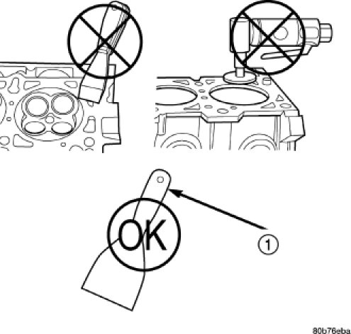 CAUTION: When cleaning cylinder head and cylinder block surfaces, DO NOT use a metal scraper because the surfaces could be cut or ground. Use only a wooden or plastic scraper (1).