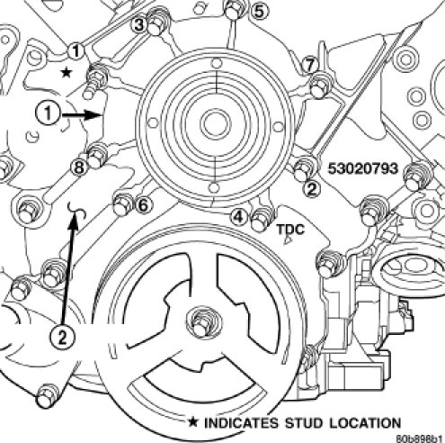 2. Using a new gasket, position water pump and install mounting bolts as shown. Tighten water pump mounting bolts to 58 Nm (43 ft. lbs.) torque.