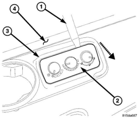 2. Using trim stick C-4755 or equivalent (1), remove the rear A/C-heater control (2) from the bezel (3) located on the right interior quarter trim panel (4), by releasing the retainer clips from the trim panel.